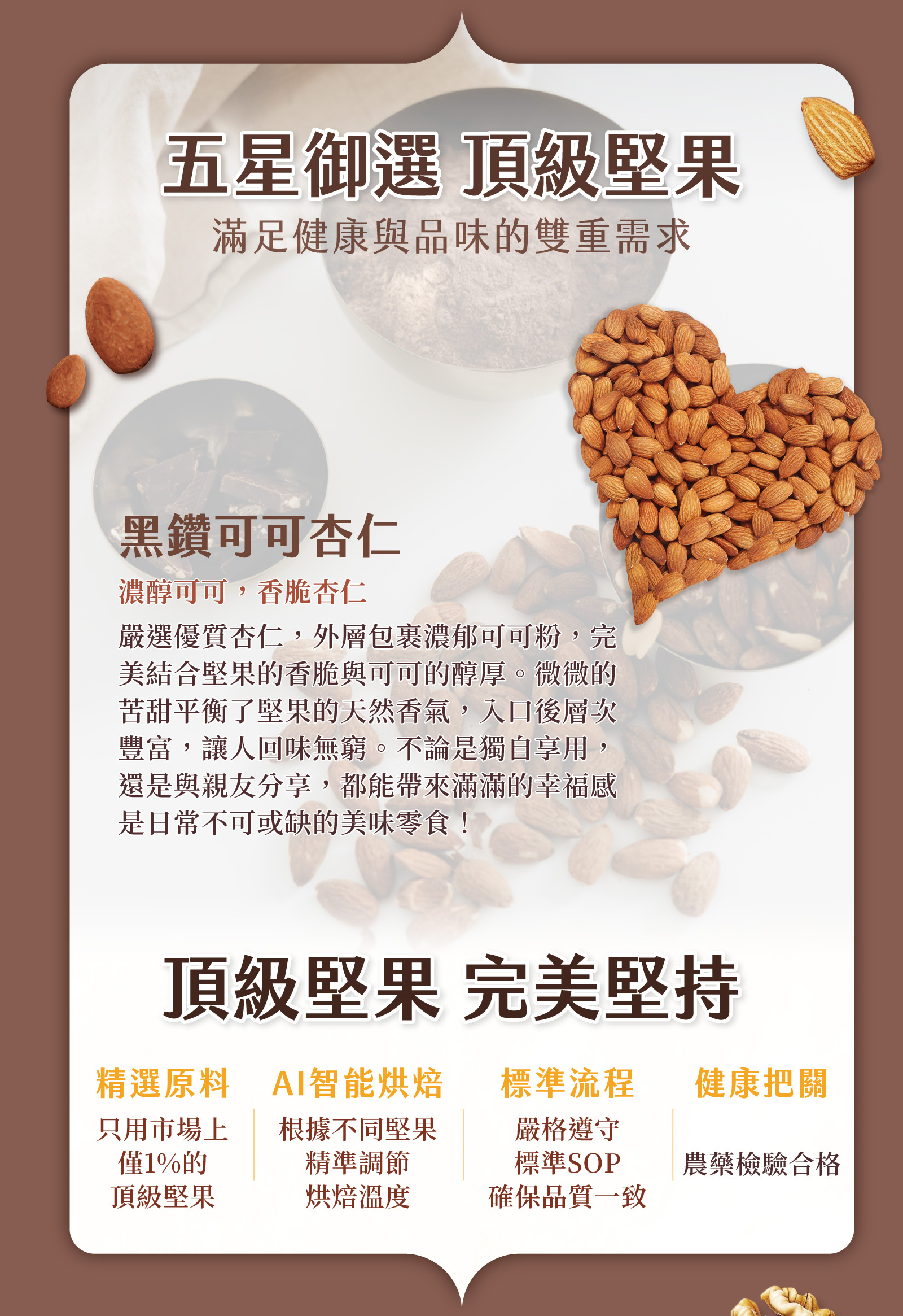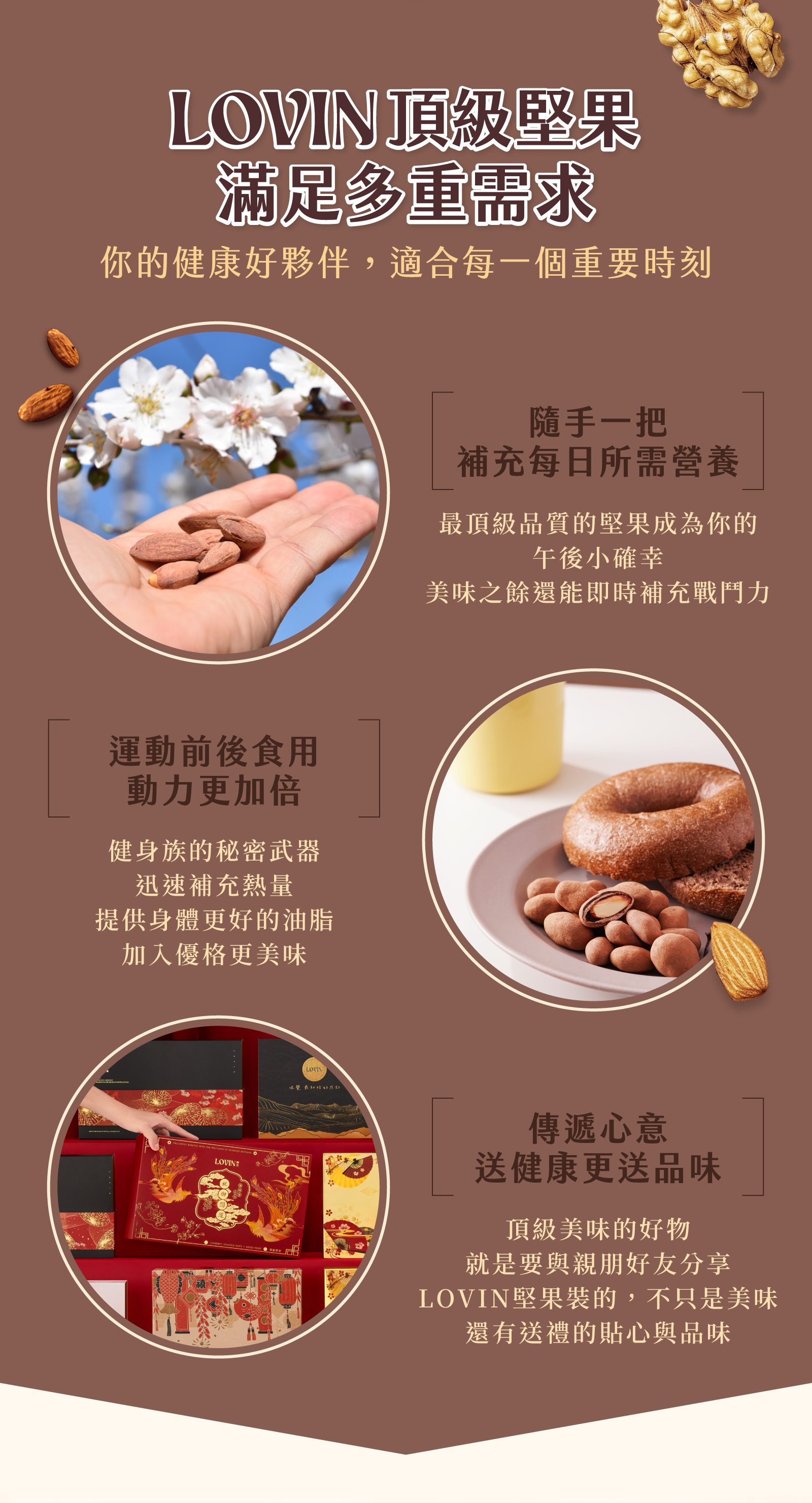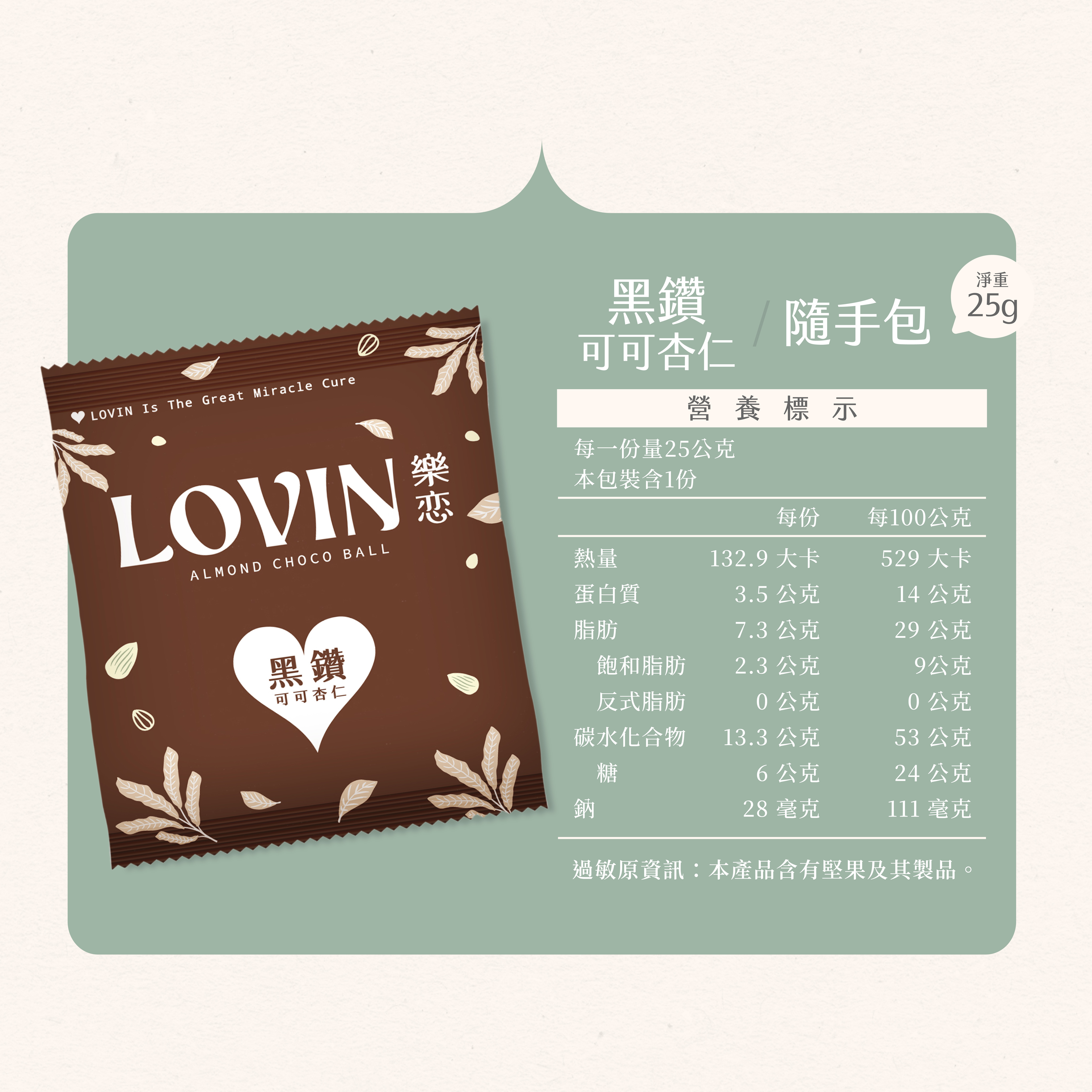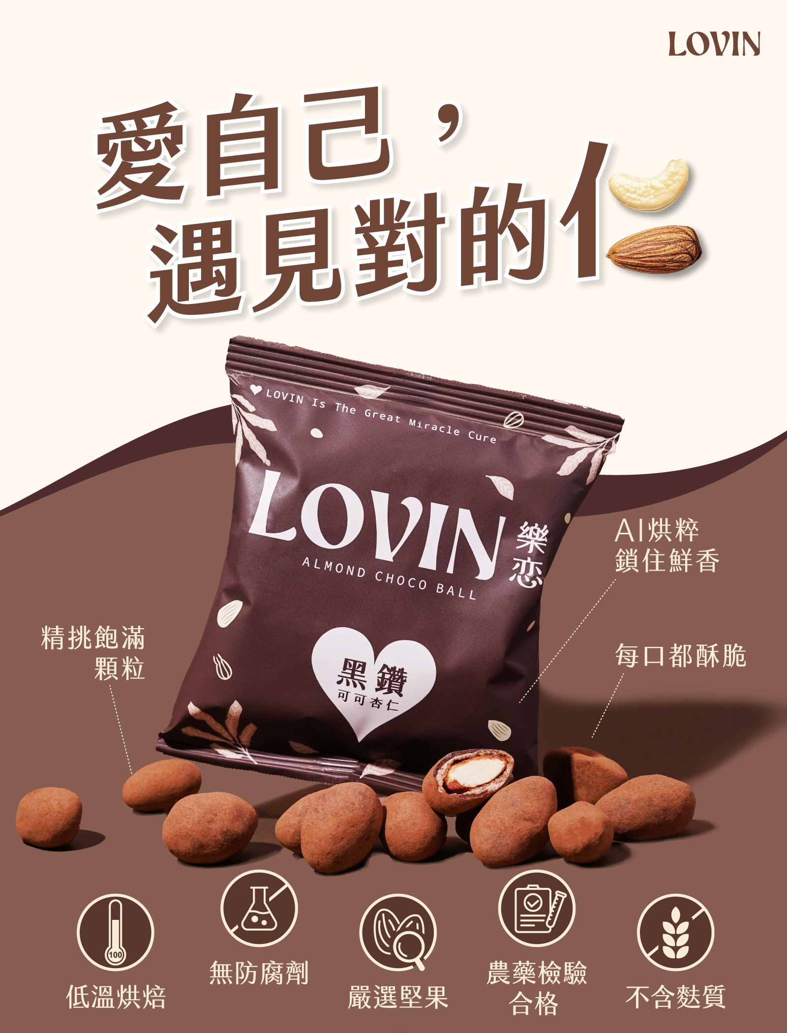 LOVIN黑鑽可可杏仁,選用濃厚黑可可,包覆酥脆飽滿杏仁,苦甜交織出成熟大人味,是講究質感與健康的完美平衡。