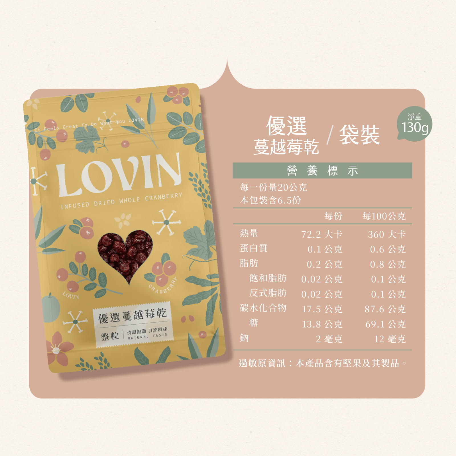 嚴選天然原料用心製作 LOVIN 樂恋獨家風味,酸甜可口的整粒蔓越莓乾,讓味蕾引領來自食物原味的感動。