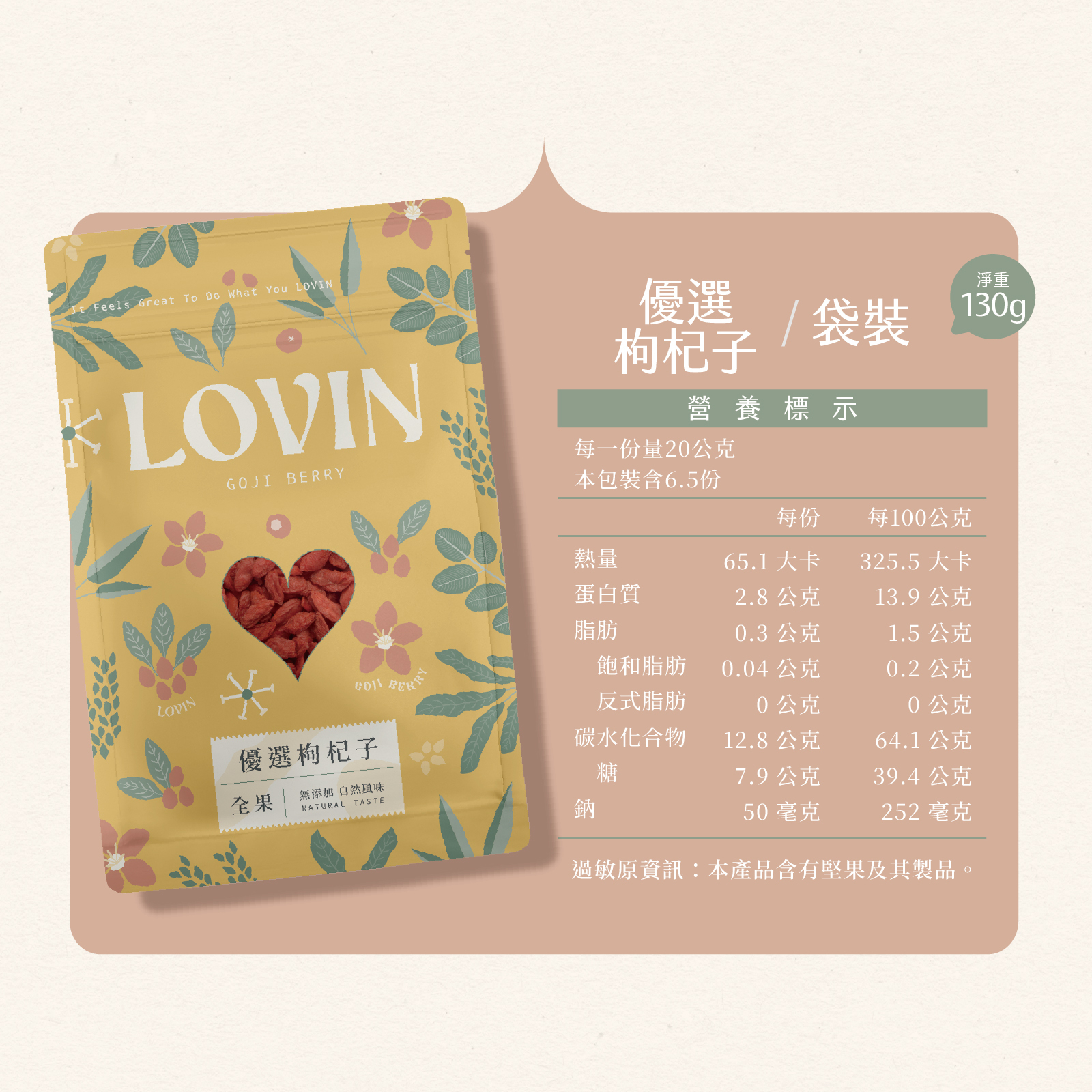 嚴選天然原料用心製作 LOVIN 樂恋獨家風味,甘甜美味的枸杞乾,讓味蕾引領來自食物原味的感動。