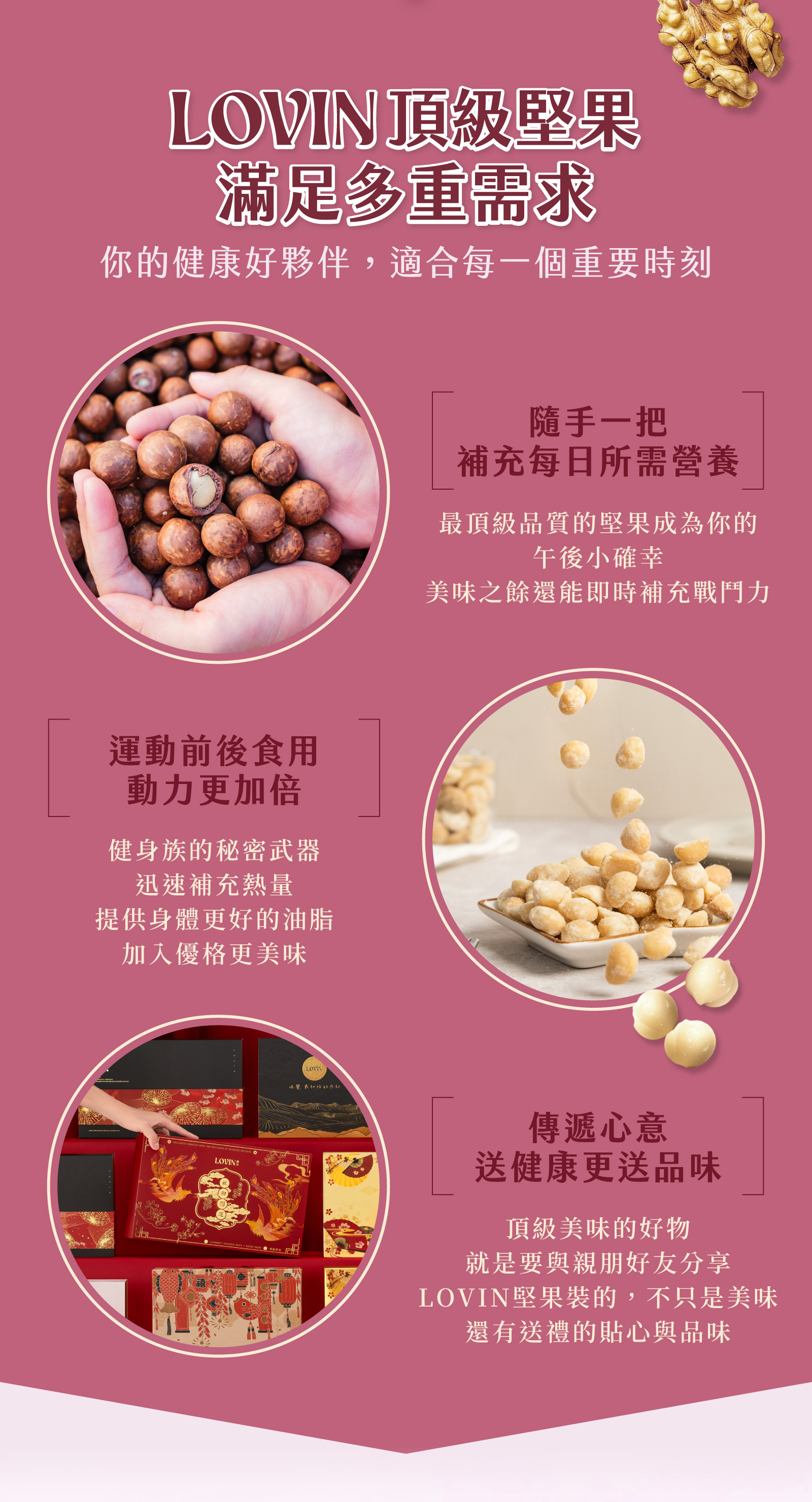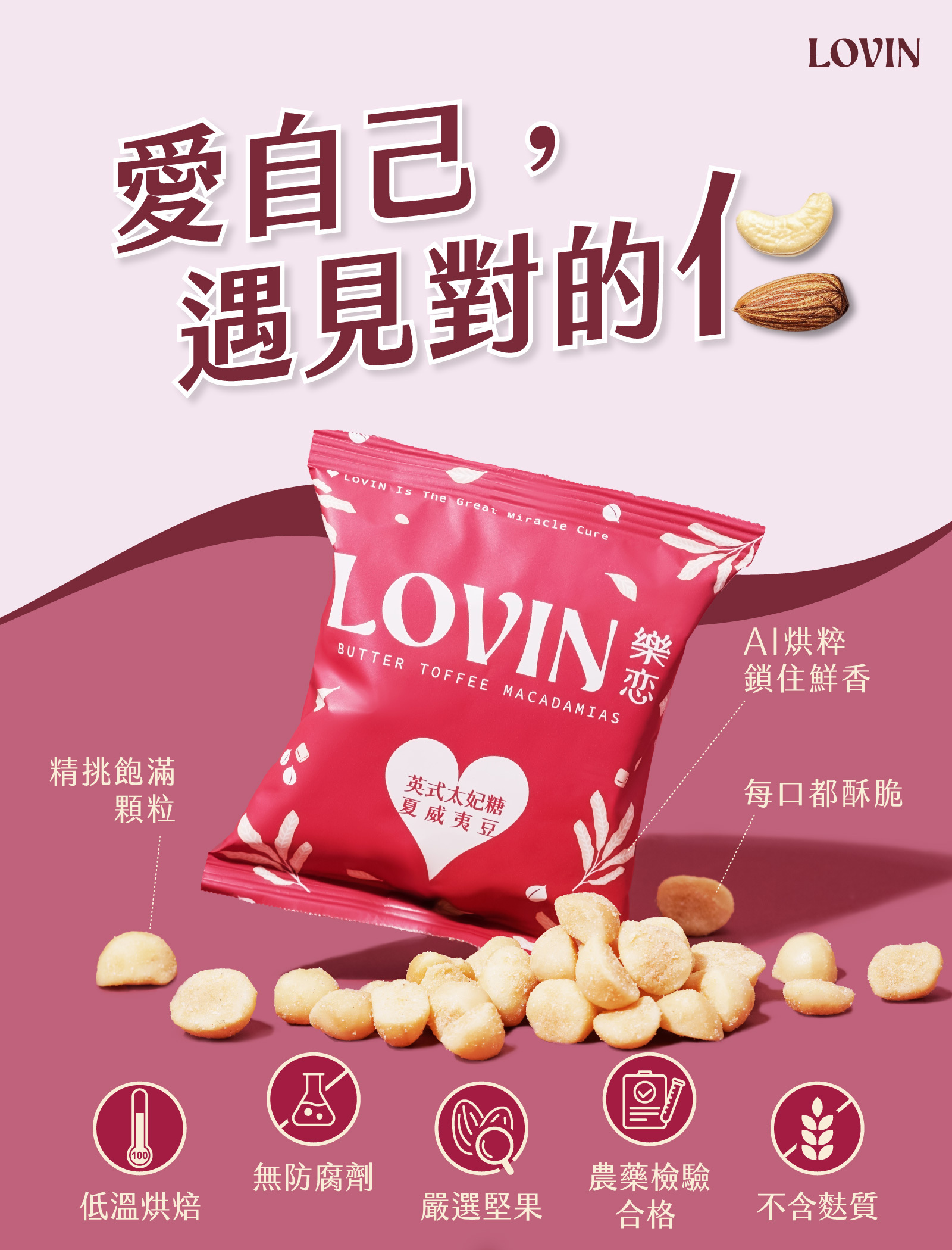 LOVIN英式太妃糖夏威夷豆,靈感源自英式經典甜點,香濃太妃糖包裹酥脆夏威夷豆,甜而不膩的高雅滋味,讓人一吃傾心。