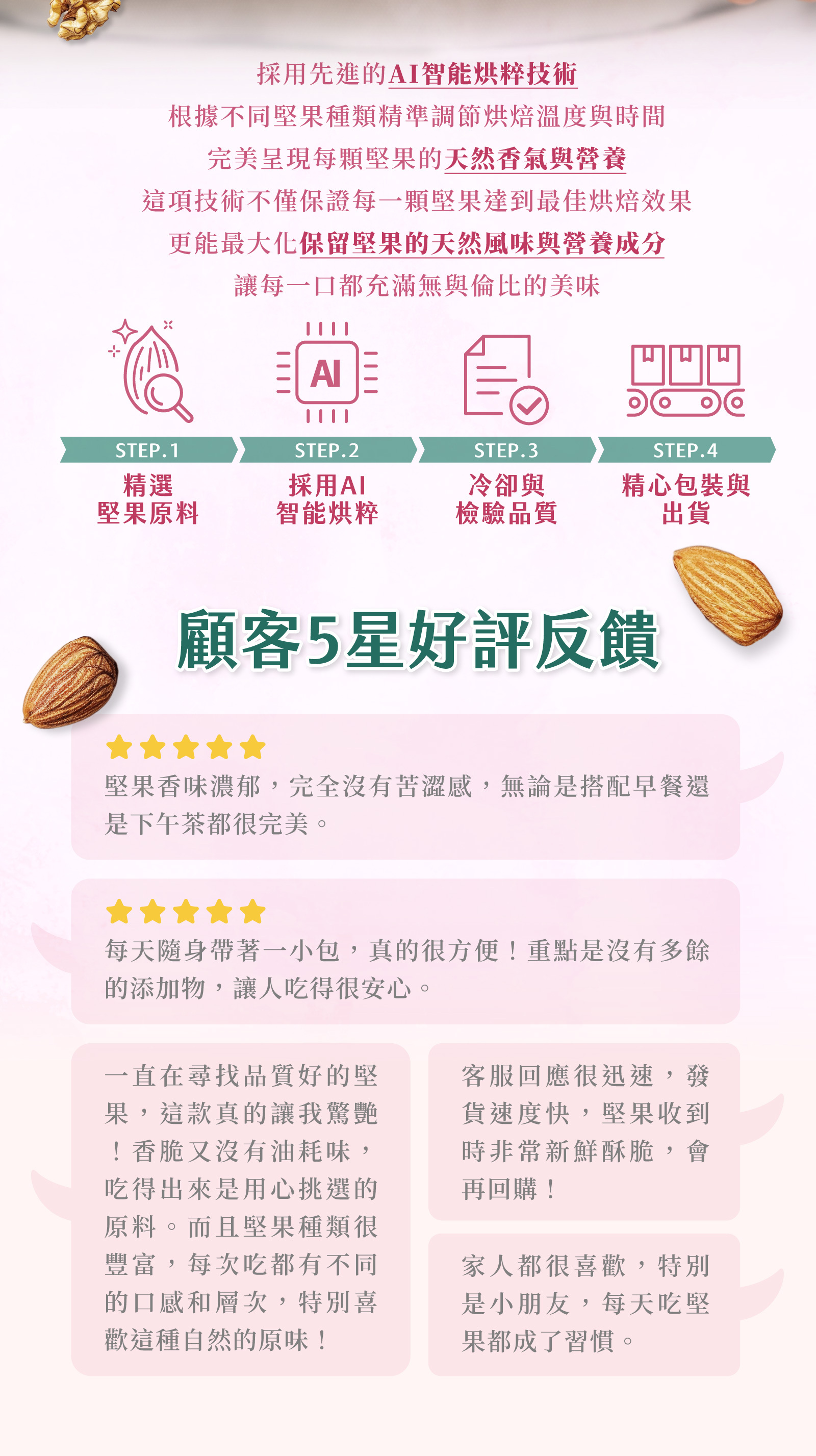 LOVIN綜合纖果,精選核桃、杏仁、澳洲夏威夷豆、蔓越莓果乾、青葡萄乾、枸杞及南瓜子,多層次風味交織,滿足營養與美味的雙重需求。