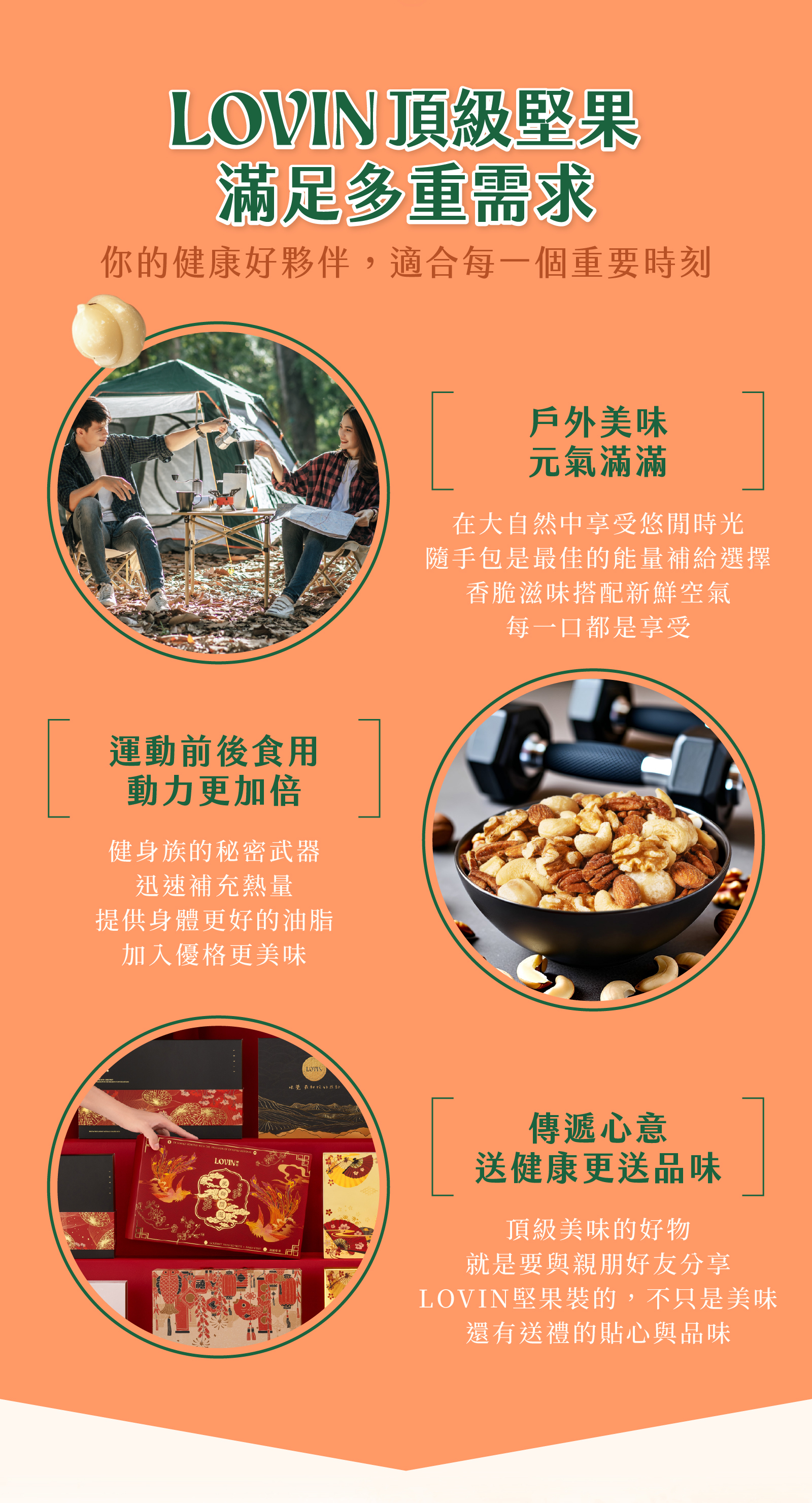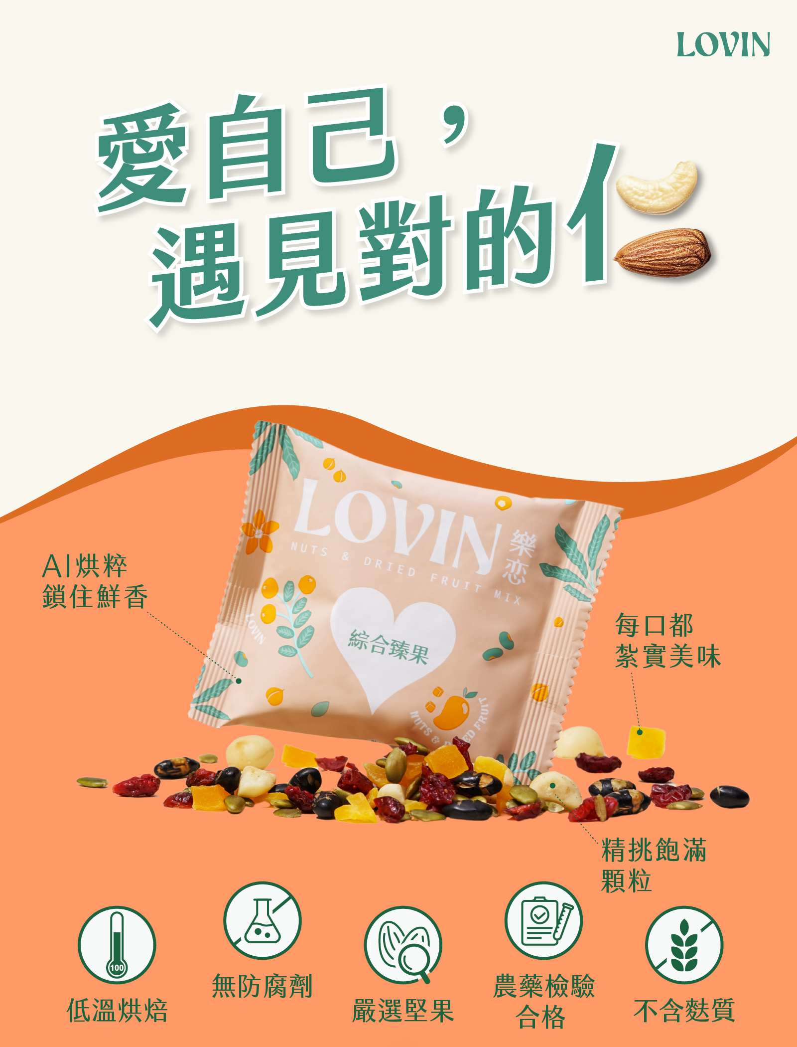 LOVIN綜合臻果,集結夏威夷果仁、南瓜子、黑豆、蔓越莓果乾與芒果乾天然風味。無添加、無負擔,香氣清爽、口感豐富,輕鬆補充每日營養。