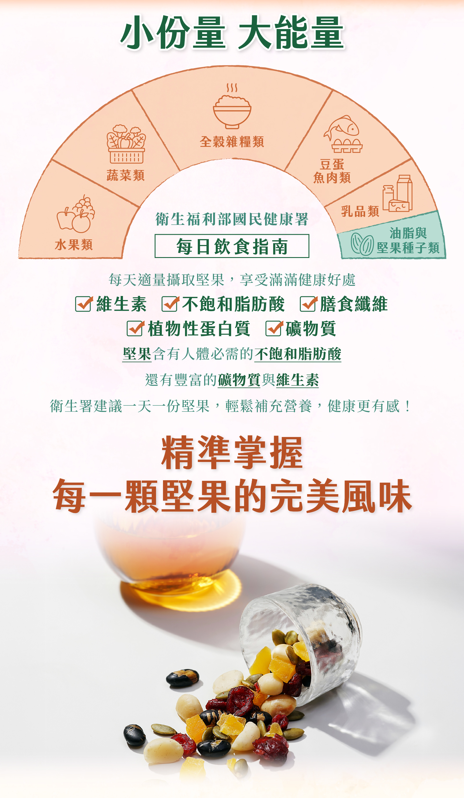 一包同時補充優質油脂、植物蛋白、膳食纖維與天然果香。從辦公室點心、運動後補給,到下午想吃點甜卻不想負擔的時刻,都是讓身心放鬆的小小輕盈享受。