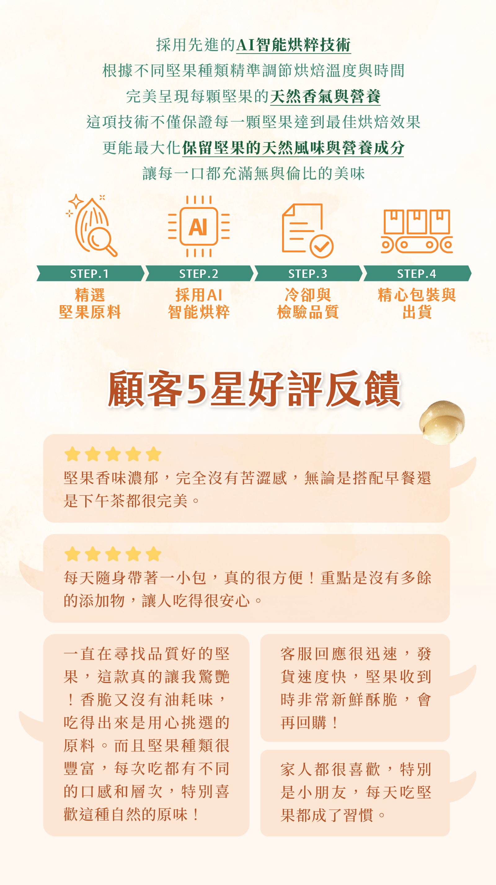 採低溫慢烘工法保留堅果營養,並維持果乾的自然果香。無多餘調味、不油不膩,呈現最貼近原貌的清爽香氣與健康口感。