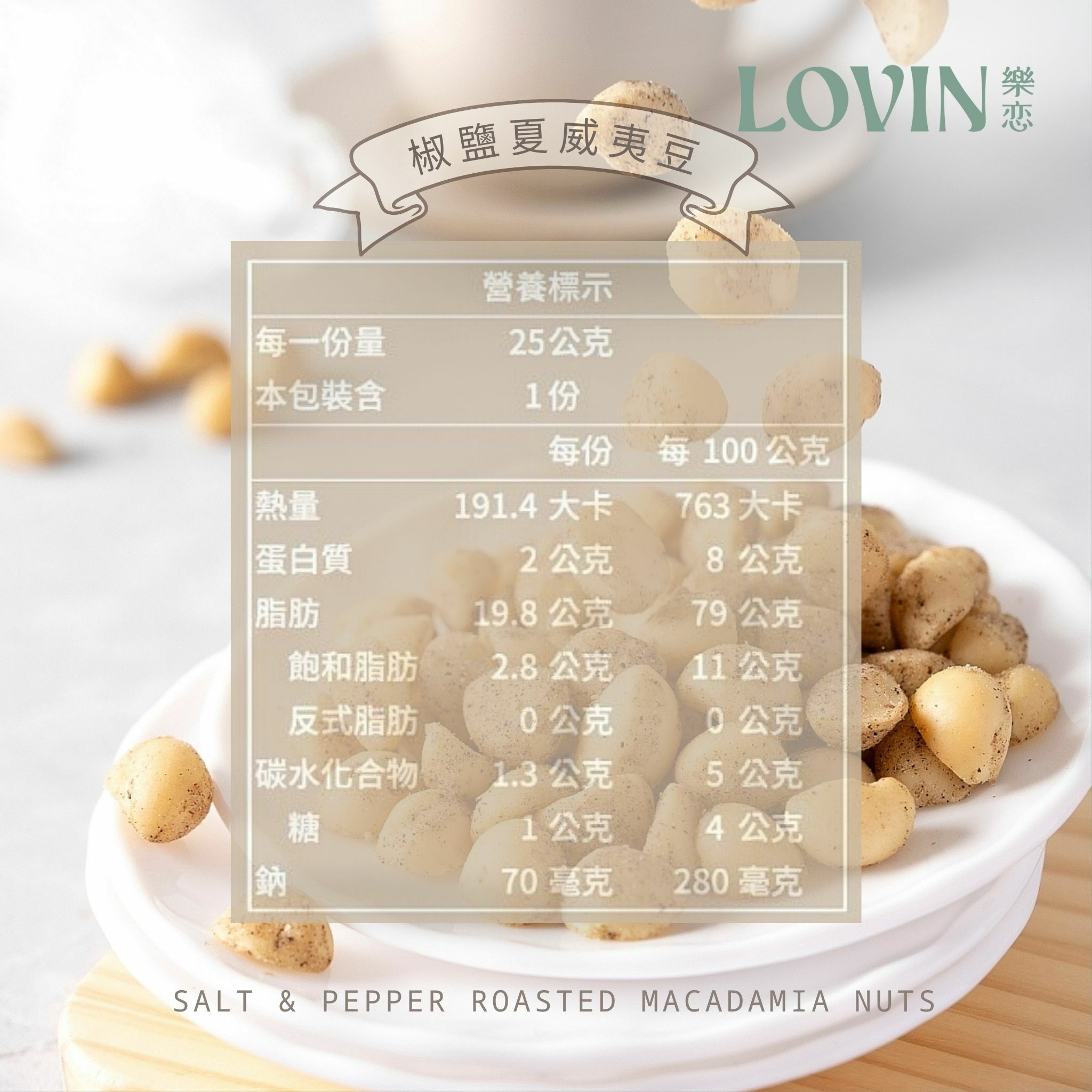 LOVIN椒鹽夏威夷豆,以細緻鹽味與微辣胡椒提味,點亮夏威夷豆的奶香脆感,是鹹食控無法抗拒的爽脆首選。