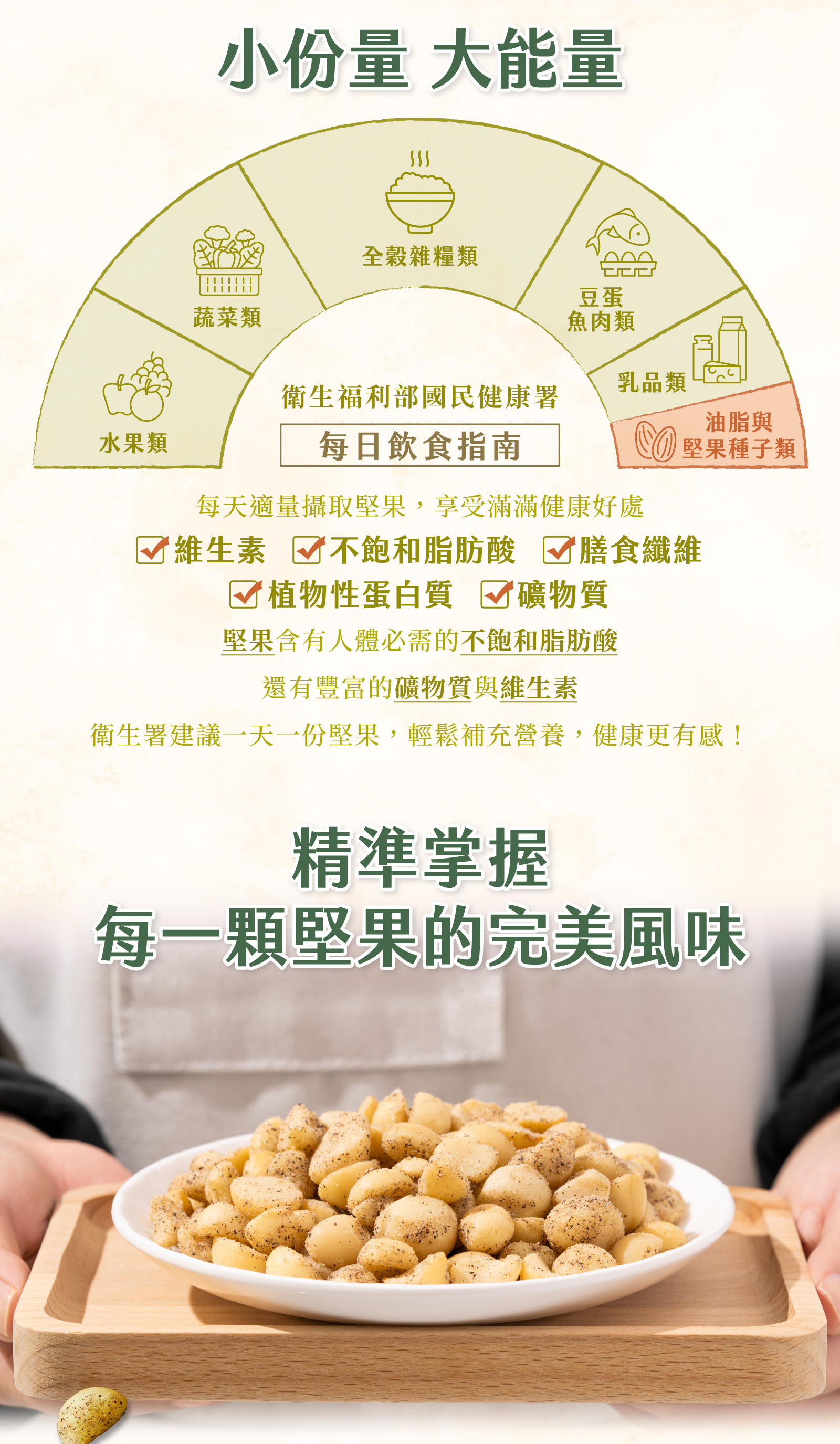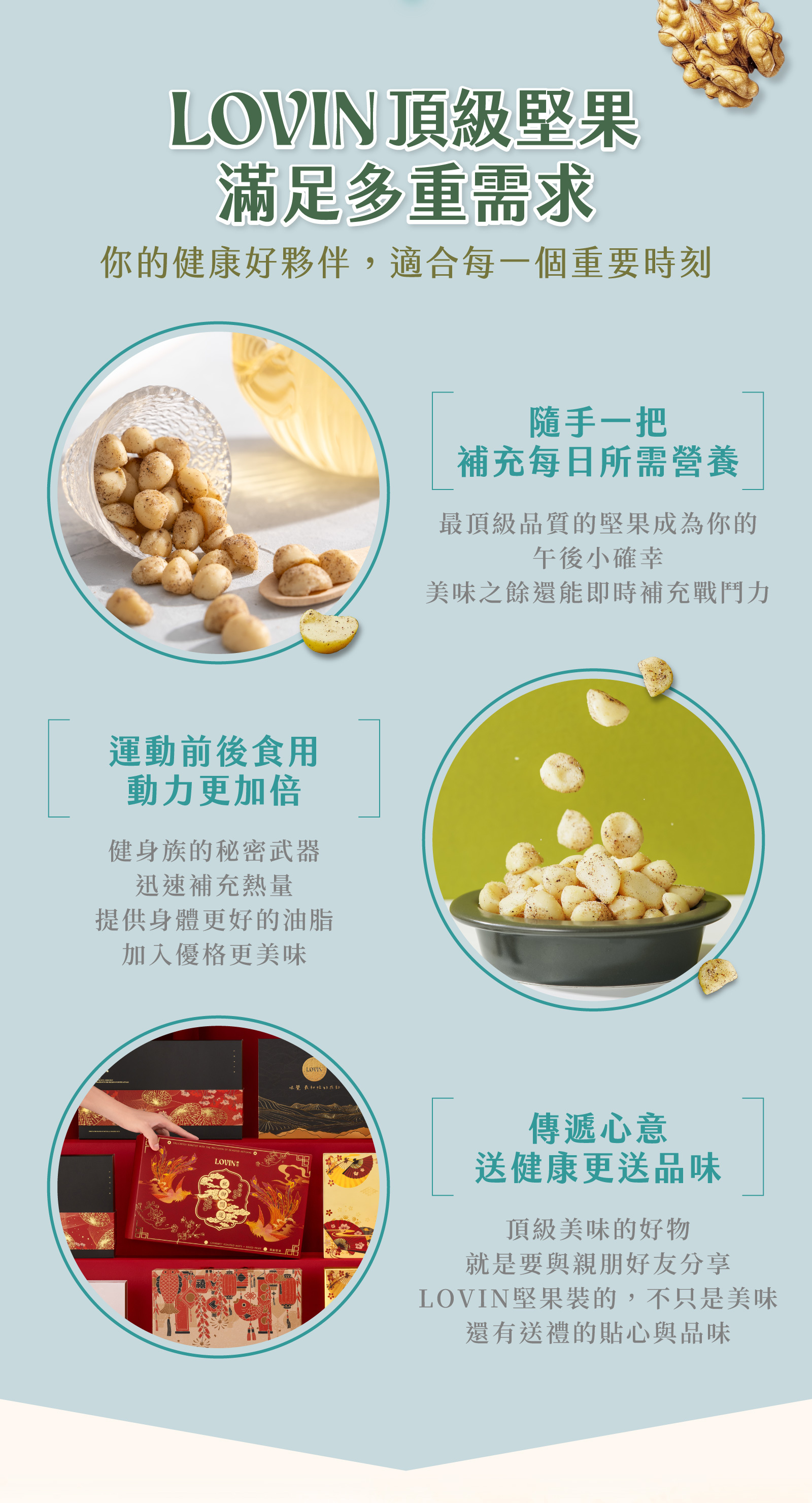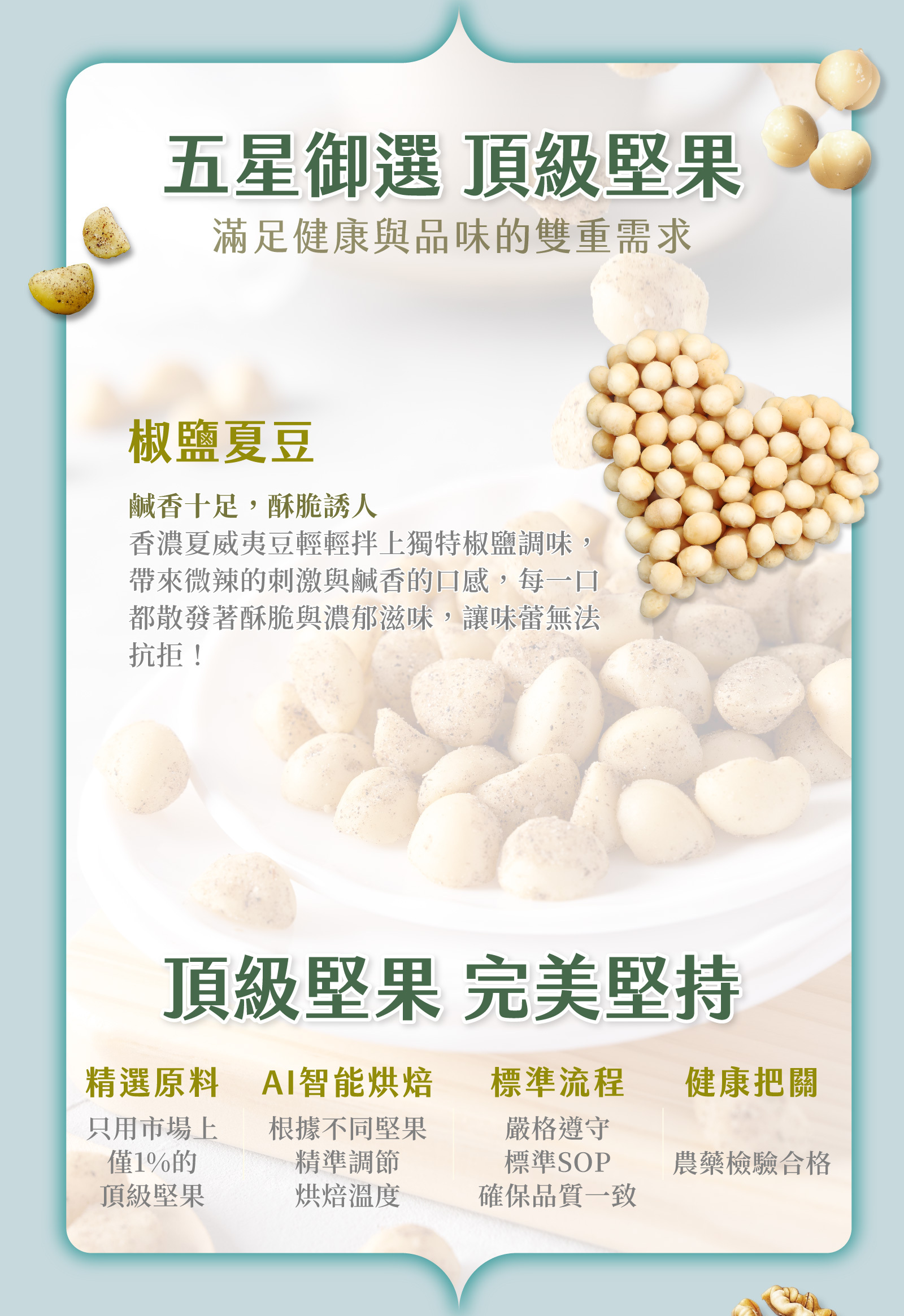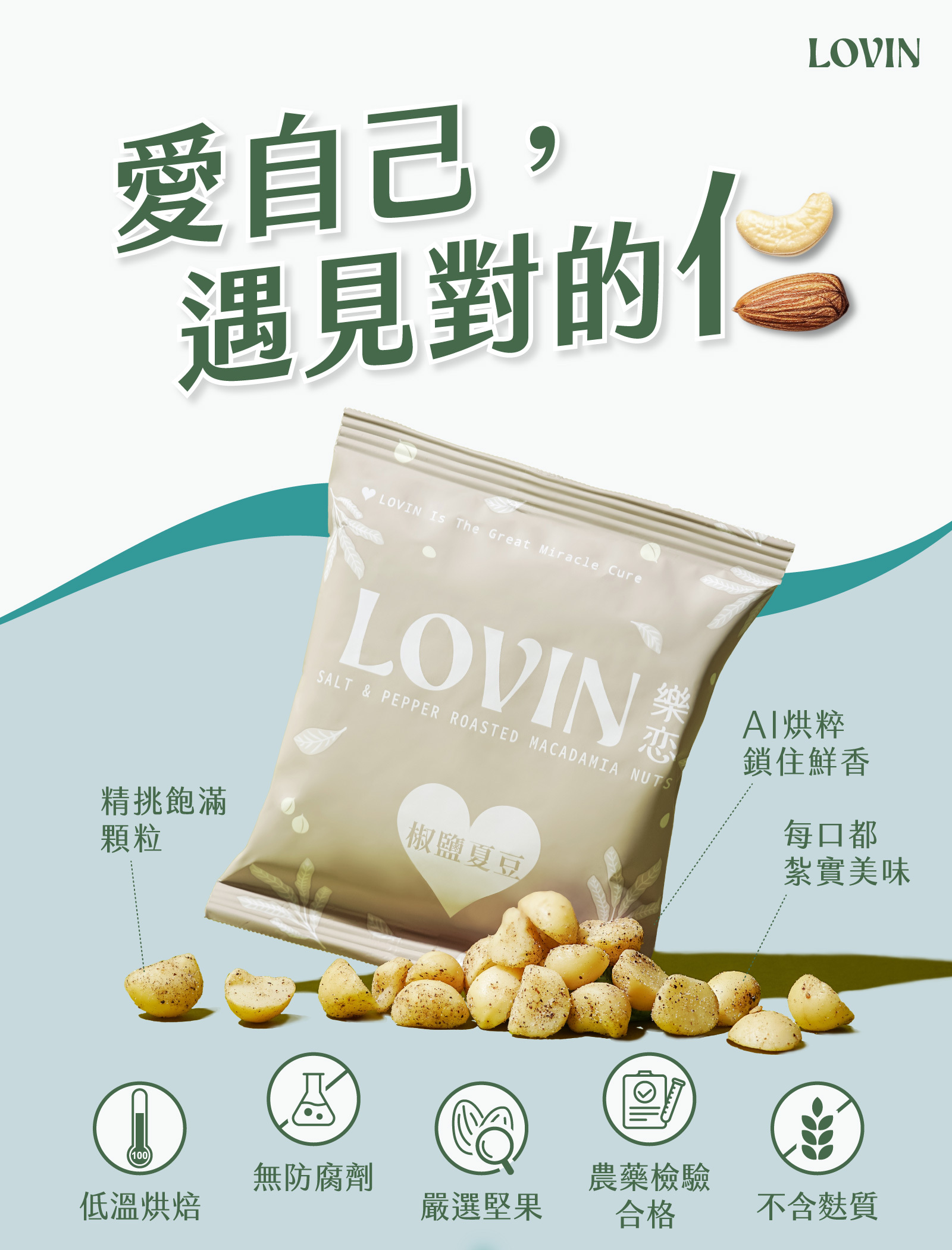 LOVIN椒鹽夏威夷豆,以細緻鹽味與微辣胡椒提味,點亮夏威夷豆的奶香脆感,是鹹食控無法抗拒的爽脆首選。